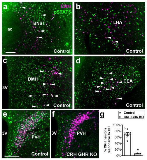 Our neuroanatomical findings not only confirm previous studies showing a high percentage of PVH CRH neurons responsive to GH [37], but they also demonstrate the presence of GH-induced pSTAT5 in CRH neurons of other brain areas. CRH neurons in the LHA are activated by dehydration/osmotic stimulation and they possibly regulate homeostatic and behavioral responses during this type of stress [57,58,59]. However, we did not test whether CRH GHR KO mice exhibit altered responses to dehydration. The distribution of CRH neurons in the lateral DMH showed here is in accordance with previous studies [52,60] and the in situ hybridization data available in the Allen Brain Atlas (https://mouse.brain-map.org/experiment/show/292, accessed on 10 August 2021). Nonetheless, the physiological importance of DMH CRH neurons remains unknown. CEA CRH neurons send descending inputs to the parabrachial nucleus [61,62]. These inhibitory projections are possibly involved in the modulation of pain perception and chronic pain [63]. Future studies are necessary to investigate whether the response to pain is altered in CRH GHR KO mice.