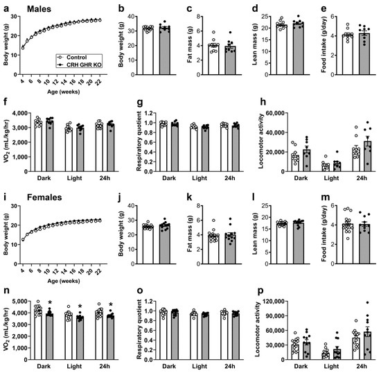 Figure 2. Reduced energy expenditure in CRH GHR KO female mice. (a) Changes in body weight along time in control (n = 10) and CRH GHR KO (n = 9) male mice. (b) Body weight. (c) Body fat mass. (d) Lean body mass. (e) Daily food intake. (f) Oxygen consumption (VO2). (g) Respiratory quotient. (h) Ambulatory activity. (i) Changes in body weight along time in control (n = 15–16) and CRH GHR KO (n = 11–12) female mice. (j) Body weight. (k) Body fat mass. (l) Lean body mass. (m) Daily food intake. (n) VO2. (o) Respiratory quotient. (p) Ambulatory activity. * p < 0.05.