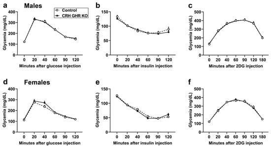 To evaluate possible changes in glucose homeostasis in mice carrying GHR ablation in CRH-expressing cells, glucose and insulin tolerance tests were performed. No differences in glucose tolerance were observed between control and CRH GHR KO mice either in males (Figure 3a) or females (Figure 3d). Likewise, GHR ablation in CRH neurons caused no alterations in insulin sensitivity in male (Figure 3b) and female (Figure 3e) mice. Glucocorticoid secretion is important to restore blood glucose levels during hypoglycemia [43,44]. Furthermore, GH action in specific brain sites regulates the counterregulatory response induced by 2-deoxy-D-glucose (2DG) injection [5]. Thus, the 2DG-induced counterregulatory response was analyzed in CRH GHR KO mice. However, CRH-specific GHR ablation did not affect the counterregulatory response induced by an acute 2DG injection in both male (Figure 3c) and female (Figure 3f) mice.