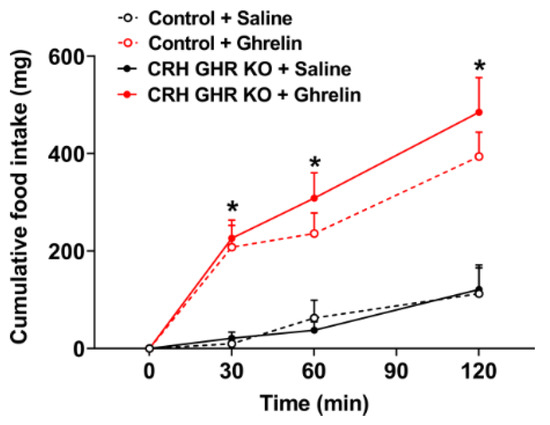 Figure 4. Ghrelin-induced food intake is normal in CRH GHR KO mice. Cumulative food intake in control (n = 5) and CRH GHR KO (n = 8) male mice that received saline or ghrelin injection. * Ghrelin-injected groups are significantly different compared to saline-injected groups (p < 0.05).