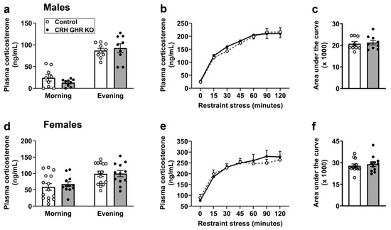 Circulating corticosterone levels vary according to the time of the day. In this regard, circulating corticosterone concentration rises just before the onset of the active phase, whereas nadir corticosterone levels are observed during the sleep phase of the day. Considering that GH secretion also presents a circadian secretion pattern [49,50,51], we evaluated whether GHR ablation in CRH neurons may affect the circadian pattern of corticosterone secretion. We observed no differences between control and CRH GHR KO mice in plasma corticosterone levels measured at the morning or at the evening in both males (Figure 5a) and females (Figure 5d). Subsequently, restraint-stress-induced corticosterone secretion was evaluated. Restraint stress led to a robust increase in plasma corticosterone levels in male (p < 0.0001; Figure 5b,c) and female (p < 0.0001; Figure 5e,f) mice. However, GHR ablation in CRH neurons did not affect corticosterone response to restraint stress.