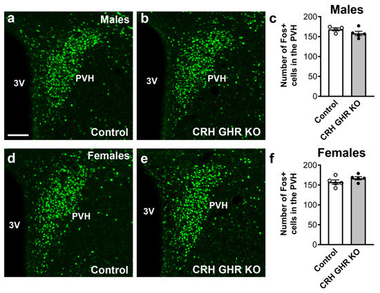 PVH CRH neurons are robustly activated during acute stress [52]. Thus, we analyzed whether GHR expression in CRH neurons may alter the activation of PVH neurons after 120 min of restraint stress. Using Fos expression as a well-established marker of neuronal activation, we observed no significant differences between control and CRH GHR KO mice in the number of Fos-positive neurons in the PVH after restraint stress in either males (Figure 6a–c) or females (Figure 6d–f).