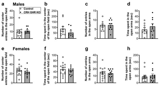 CRH neurons in the PVH and other brain areas are key regulators of anxiety [36,53,54,55,56]. Therefore, possible changes in anxiety were evaluated in CRH GHR KO mice during the open field and elevated plus maze tests (Figure 7). During the open field test, control and CRH GHR KO male and female mice entered a similar number of times in the center (Figure 7a,e). Additionally, no difference in the time spent in the center of the open field was observed between control and CRH GHR KO mice (Figure 7b,f). Likewise, the number of entries and the time spent in the open arms during the elevated plus maze test were not different between the experimental mice in both males (Figure 7c,d) and females (Figure 7g,h). Of note, the distance traveled and the movement time in the open field and elevated plus maze tests were similar comparing control and CRH GHR KO mice (data not shown).