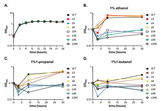 - Horinouchi, T.; Maeda, T.; Furusawa, C. Understanding and engineering alcohol-tolerant bacteria using OMICS technology. World J. Microbiol. Biotechnol. 2018, 34, 157. [Google Scholar] [CrossRef]