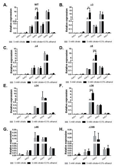 2.4. Gene Expression Patterns of Wild-Type and Mutant Strains in the Presence of Ethanol