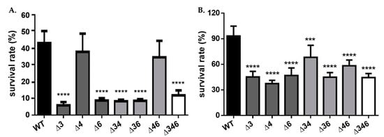2.7. Adh3 and Adh6 Are Associated with Virulence against G. mellonella