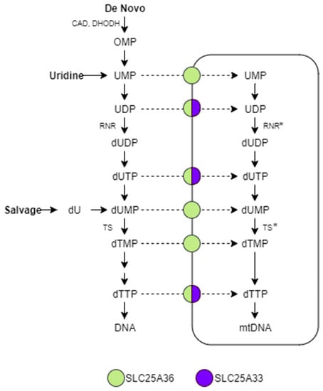 - Di Noia, M.A.; Todisco, S.; Cirigliano, A.; Rinaldi, T.; Agrimi, G.; Iacobazzi, V.; Palmieri, F. The human SLC25A33 and SLC25A36 genes of solute carrier family 25 encode two mitochondrial pyrimidine nucleotide transporters. J. Biol. Chem. 2014, 289, 33137–33148. [Google Scholar] [CrossRef] [PubMed]