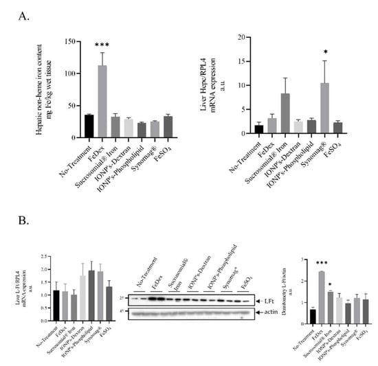 Hepcidin is an iron-regulatory hormone synthesized mainly by hepatocytes and secreted into the circulation as a 25 Amino-acids-long peptide that acts as a negative regulator of iron absorption from the duodenum and iron release from macrophages, recycling old red blood cells and thus adjusting iron supplies to the body’s iron requirements []. We have previously demonstrated that the measurement of hepcidin is helpful for guiding safe iron supplementation in piglets [,,,]. Here, we found that hepatic hepcidin mRNA is upregulated only in piglets supplemented with SI and Synomag®. This increase was not statistically significant in comparison to anemic animals (Figure 1A). Interestingly, concentrations of hepcidin-25 in the blood plasma of piglets supplemented orally with iron preparations or parenterally with FeDex are below the lower limit of detection, i.e., 0.5 nM (Data Not Shown).