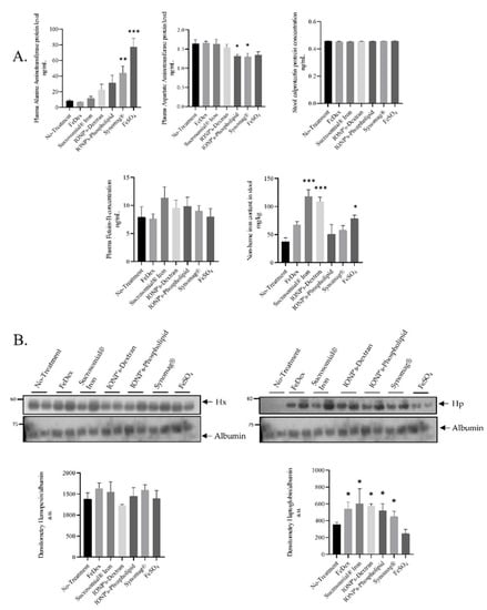 Fetuin-B is an acidic glycoprotein belonging to the Fetuin family and is a well-known negative acute phase protein. Fetuin-B, being a negative acute phase protein, takes part in the process of deactivating macrophages to restrain the innate immune response []. In plasma of piglets receiving SI and IONPs per os, we did not observe any changes in fetuin-B concentration, although upregulation in the SI-supplemented group was visible, albeit not statistically significant. Such an increase in fetuin-B levels may be due to the high levels of iron detected in the stool (Figure 2A), which then may contribute to the irritation of the gastrointestinal mucosa. The lack of oral supplementation or parenteral supplementation does not increase iron content in the stool, which translates into a low level of both calprotectin and fetuin B. We did not observe any changes in the plasma concentrations of transaminases Aspartate aminotransferase (AST) and alanine aminotransferase (ALT) in any of the examined group of animals (Figure 2A), except in Synomag® and FeSO4-treated animals, where elevated ALT levels may be indicative of liver damage []. Acute-phase proteins, haptoglobin, C-reactive protein, and serum amyloid A (SAA) can be used as useful biomarkers for analyzing the risk of exposure to nanomaterials and associated toxicity []. Some data strongly suggest that hemopexin may serve as a biomarker for the analysis of biological responses related to an exposure to silica nanoparticles smaller than 100 nm []. Therefore, we decided to test hemopexin and haptoglobin serum levels in experimental piglets. We did not find any significant differences in the levels of hemopexin in iron-supplemented piglets compared to the controls, as shown by the Western blot analysis. In contrast, the densitometry of plasma haptoglobin bands revealed significant differences compared to controls in all iron-treated animals excluding FeSO4 supplementation (Figure 2B).