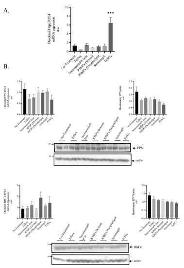Oral FeSO4 administration but not Sucrosomial iron or IONPs increases duodenal hepcidin level without affecting duodenal iron transporters: (A): Duodenal Hepcidin mRNA expression in 28 day-old piglets (n = 6 per experimental group); (B): Analysis of duodenal iron transporters. Duodenal mRNA lof FPN and DMT1 levels and protein analysis by Western blot, as well as its densitometry, is shown. The samples were normalized for protein loading by actin. The data are expressed as arbitrary units obtained by analyzing the bands using the software Quantity One 4.6, Bio-Rad. Data are the mean ± SEM of n = 3 independent experiments carried out on 6 subjects for each experimental group. Data were analyzed with unpaired Student’s t test, *** asterisks denote statistically significant differences at p < 0.001 in comparison to control, non-supplemented animals.
