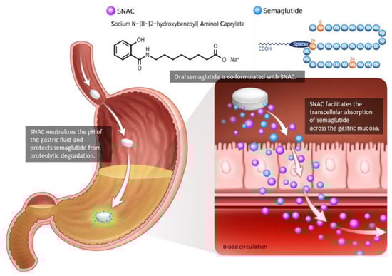 As the peptide-based drug is degraded by proteolytic enzymes and the pH of the gastrointestinal tract, semaglutide must be injected subcutaneously. Semaglutide could be developed as an oral tablet by combining it with an absorption enhancer known as sodium N-(8-[2-hydroxybenzoyl]amino) caprylate (SNAC) [32,33] (Figure 2). In a concentration-dependent manner, SNAC forms a noncovalent bond with GLP-1, increasing lipophilicity and transcellular absorption of semaglutide through the stomach epithelium [32,34]. Additionally, in the acidic environment of the stomach, SNAC acts as a local pH buffer for semaglutide, increasing solubility and protecting the drug from degradation [34]. As SNAC’s activity is brief and reversible, it separates from the medication once it reaches the bloodstream [32].