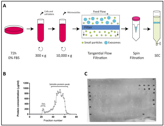 Isolation of exosomes from Colo-320 cells. (A) Experimental procedure for isolation of exosomes from conditioned medium of Colo-320 cells. Cells were cultured in serum-free conditions for 72 h before collection of the medium, which was then sequentially centrifuged at 300× g to remove cells and large debris and at 10,000× g to remove larger EVs such as microvesicles. Medium was then concentrated by tangential flow filtration and spin filtration to a final 1.0 mL volume. Exosomes were finally isolated by size exclusion chromatography (SEC). (B) A representative SEC elution profile showing the protein concentration of the 70 fractions (0.5 mL each) typically collected. (C) Dot blot showing the fractions containing exosomes, based on the presence of the exosomal marker CD81.