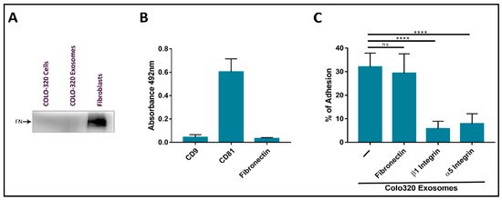 Several groups have reported that exosomes produced by different cell types, including cancer cells, are coated with the extracellular protein fibronectin, and that this coat plays important roles in the interaction between these EVs and recipient/target cells and in directing cell movement through the tissues [24,25,26,27,28]. The origin of the fibronectin found on exosomes can be endogenous from biosynthesis in the producing cells or exogenous from the bovine fibronectin present in FBS added to culture medium. In order to exclude exogenous fibronectin, we routinely deprived Colo-320 cancer cells of FBS for 72 h before exosome isolation. Following this protocol, we could not detect the presence of fibronectin on the surface of Colo-320 cancer cells by flow cytometry (Supplementary Figure S1) or in cell lysates by western blot (Figure 3A), which would indicate that these cells do not biosynthesize this protein. As a positive control, we detected abundant fibronectin on the surface of human fibroblasts cultured under the same conditions (72 h of FBS-deprivation) both by flow cytometry (Supplementary Figure S2A) and in cell lysates by western blot (Figure 3A). Therefore, as expected from the lack of fibronectin biosynthesis in these cells, this ECM protein could not be detected on the exosomes released by Colo-320 cells by either western blot (Figure 3A) or by ELISA (Figure 3B).