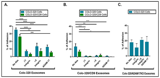 The presence of CD9 reduced cell adhesion to immobilized exosomes that was mediated by cellular integrin α5β1 and exosomal ADAM17. Cell adhesion of Colo-320 or Colo-320/CD9 to exosomes produced by Colo-320 cells (A), Colo-320/CD9 cells (B), and Colo-320/ADAM17-KO cells (C). Cells were stimulated with phorbol ester PMA (200 ng/mL) for 1 h, loaded with the fluorescent probe BCECF-AM and then allowed to adhere to immobilized exosomes (5 μg of exosomal protein per well) for 60 min at 37 °C under physiological conditions of Ca2+/Mg2+ (0.5 mM/1 mM, respectively). The percentage of cells that remained adhered is indicated as mean ± SEM of four experiments, performed in duplicates. Statistical analysis performed was two-way ANOVA. * p < 0.05, ** p < 0.01, *** p < 0.001, **** p < 0.0001.