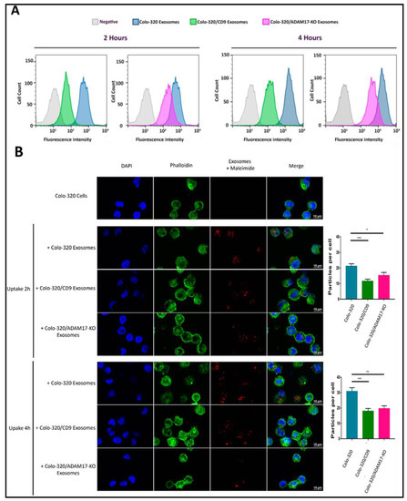 Expression of exosomal CD9 and knocking-out ADAM17 expression in exosomes reduced the uptake of exosomes by Colo-320 recipient cells. (A) Flow cytometry quantitation of the uptake by Colo-320 recipient cells of fluorescently labelled exosomes produced by Colo-320, Colo-320/CD9 and Colo-320/ADAM17-KO cells, after 2 and 4 h or cell−exosome co-incubation. (B) Confocal microscopy images showing the uptake by Colo-320 recipient cells of the different exosomes as in (A). The bar graphs show the quantification of exosomal uptake by counting the particles internalized by at least 80 cells for each condition in three separate experiments. Statistical analysis performed was one-way ANOVA. * p < 0.05, ** p < 0.01 *** p < 0.001.