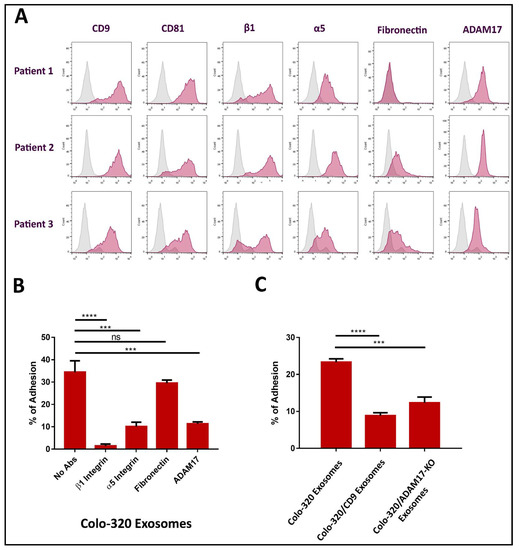Several reports indicate that integrin α5β1 can engage in cis (on the same cell) and trans (on different cells) interactions with the distintegrin (Dis) domain of the metalloproteinase ADAM17/TACE [14,15,17,18]. Our group showed that the tetraspanin CD9 negatively regulated integrin α5β1-mediated adhesion of cancer cells both to its canonical ligand fibronectin and to ADAM17 as a novel ligand [14,15]. Furthermore, we and others have reported that CD9 interacts directly with ADAM17 on the cell surface and regulates negatively both the sheddase and adhesive activities of this metalloproteinase [12,13,14,15,19,20,21]. Therefore, we decided to investigate whether integrin α5β1 and ADAM17 interaction and the regulatory effects of CD9 also played a role in mediating the binding of exosomes and their uptake by cancer or mesothelial recipient cells, which could bear relevance during the peritoneal dissemination of colorectal carcinomas.