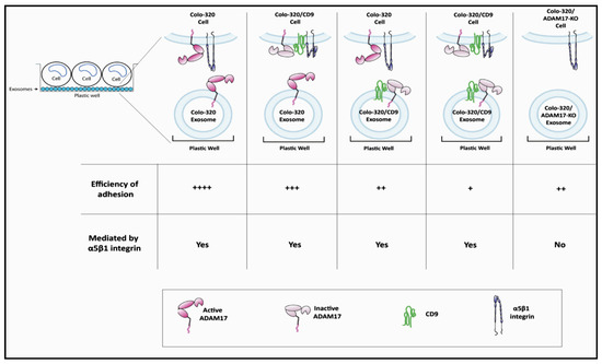 Schematic representation of the involvement of ADAM17, CD9 and integrin α5β1 in interactions between exosomes and cells. The interaction of exosomes with cells was mediated by integrin α5β1 in cells and ADAM17 in exosomes and was regulated by CD9. Cells adhered more efficiently to exosomes lacking CD9. Knocking-out ADAM17 expression in exosomes reduced cell−exosome interactions, which were no longer mediated by cellular integrin α5β1. (Efficiency of adhesion is comparatively assigned: ++++ denotes highly efficient adhesion; +++ denotes efficient adhesion; ++ denotes less efficient adhesion; + denotes least efficient adhesion).