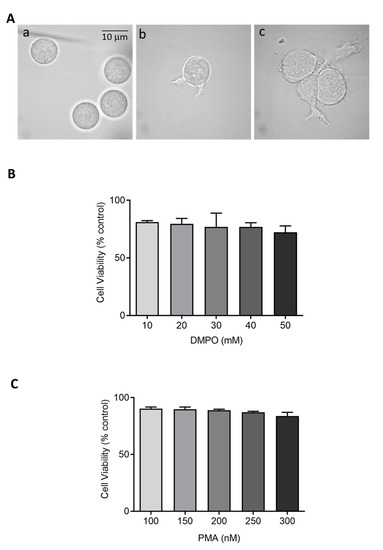 (A) Morphology of U-937 cells in the absence (a) and presence of 150 nM PMA for 48 h (b) and 72 h (c) post incubation at 37 °C. (B,C) Cell viability (%) of U-937 cells post incubation with DMPO and PMA at varying concentration. The data are represented as mean ± SE.