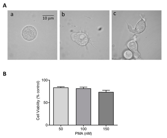 (A) Morphology of HL-60 cells in the absence (a) and presence of 50 nM PMA for 48 h (b) and 72 h (c) post incubation at 37 °C. (B) Cell viability (%) of HL-60 cells post treatment with 50 nM, 100 nM, and 150 nM PMA. The data are represented as mean ± SE.