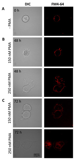 Staining of U-937 cells with FM4-64 (5 min, RT) to check membrane integrity in non-differentiated (A) and differentiated cells for 48 h (B) and 72 h (C). In both B and C, the upper panel shows U937 cells treated with 150 nM PMA, while the lower panels are cells treated with 250 nM PMA. Individual channels for DIC and FM4-64 (red signal) are presented.