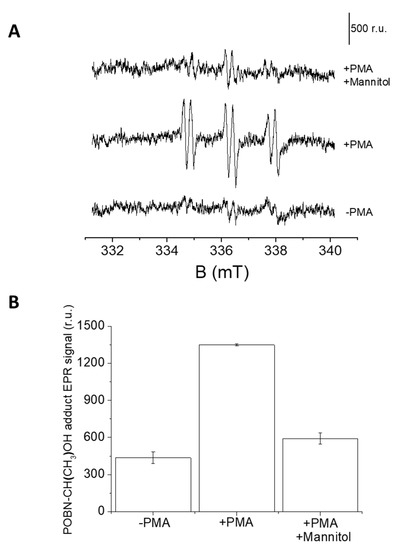 In the EPR spin trapping data obtained using the mannitol, which is a potent HO• scavenger, the POBN-CH(CH3)-OH adduct EPR signal was found to be significantly suppressed, which indicates that HO• is predominantly formed during respiratory burst induced with PMA (Figure 7A). The mannitol-insensitive POBN-CH(CH3)-OH adduct EPR signal (~15%) is likely due to specificity of mannitol or inclined affinity of HO● towards POBN compared to mannitol. It has been previously proposed that HO● detected in the cells are formed by the dismutation of O2●− to H2O2 and subsequently forming HO● in the presence of metal ions [6].