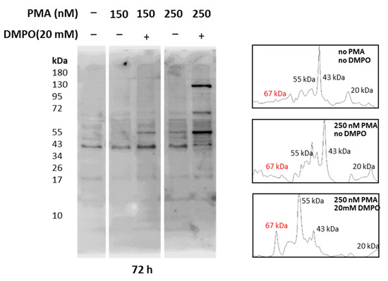 Whole-cell homogenate extracted from U-937 cells treated with PMA and DMPO was separated using SDS PAGE and bands were visualized with Coomassie blue staining. As entire cell homogenate was used for analysis, bands of 17 kDa, 35 kDa, 40 kDa, 43 kDa, 55 kDa, 67 kDa, and 130 kDa were observed (Supplementary Figure S3). Reactive oxygen species generation from cells differentiated with PMA has been proven above with EPR spectroscopy and confocal microscopy (Figure 5, Figure 6 and Figure 7), while intermediate species, namely protein-centered radicals formed by these ROS species, were confirmed with spin trap DMPO (nitrone adducts) [40,41]. To identify proteins tagged with DMPO, total homogenates from cells treated with PMA and DMPO were analyzed using an anti-DMPO western blot analysis. Total cell homogenate blots incubation with a specific antibody revealed more than 10 bands (Figure 8). Upon differentiation, expression of 130 kDa protein became evident with an increasing concentration of PMA, and protein bands of 55 kDa and 67 kDa were enhanced comparatively with respect to controls. Densitograms illustrating protein expression in comparison to DMPO controls are included in Supplementary Figures S4 and S5.