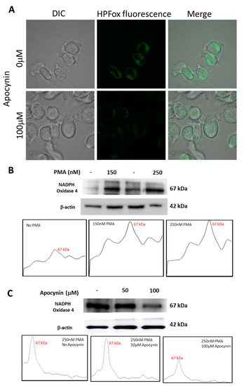 U-937 cells treated with apocynin prior to differentiation with PMA displayed a reduction in HO● generation and the same was validated using HPF fluorescent probes by confocal laser scanning microscopy. It can be seen from Figure 9 that HPFox fluorescence was higher in control samples compared to apocynin treated samples. The intracellular HO● generation was comparatively higher in the control sample (Figure 9A, upper panel) treated with 250 nM PMA alone and found to be partially suppressed in the presence of 100 μM apocynin (Figure 9A, lower panel). Activation of NADPH oxidase enhances ROS production resulting in oxidative stress and subsequent dysfunctional regulation of signal transduction cascades leading to pathological changes [42,43]. From Figure 9B, it is apparent that expression of NOX4 becomes evident with increasing concentration of PMA. The corresponding densitograms are shown as a part of Figure 9B. Nevertheless, incubation with apocynin prior to differentiation with PMA reduces NOX4 expression (Figure 9C). The differences in NOX4 expression patterns with increasing concentrations of apocynin are represented as densitograms in Figure 9C. Taken together, our data showed that NOX4 expression remained upregulated in the PMA induced differentiating macrophage cell line, while treatment with apocynin downregulated NOX4 in the in vitro system. However, differences in inhibitory pattern can be attributed to the availability of myeloperoxidase, which initiates active apocynin dimer conformation to oxidize NOX [44]. Variance in NOX4 expression pattern upon treatment with different concentrations of PMA and apocynin is presented as Supplementary Figure S6.