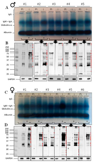 Amido black staining was used to reveal the different immunoglobulins present in the pre-immune and immune sera of male and female voles after subcutaneous immunization with whole spermatozoa (Figure 1). Comparison of the pre-immune (Pi) and immune (i) sera for each immunized animal showed a clear increase in the corresponding IgM-IgA bands for four males (1, 2, 4, and 5; Figure 1A) and five females (1 to 5; Figure 1C). The IgG appeared as a smear (pattern that extended from the loading slot to the IgM band) that increased in immune sera, compared to pre-immune sera, especially for males 1, 2, 4, and 5 and for females 1, 2 and 4 to 6 (* in Figure 1A,C).