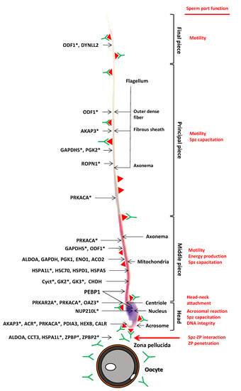 We then arbitrarily set a threshold for the mean fold change at 2 (mFC, corresponding to the quantitative difference for a given protein after its immunoprecipitation with the pre-immune and the immune sera). Among the 120 proteins, 38 had a mFC >2 after IP with both the male and female immune sera (Table S2, not highlighted), 49 were specific to the female sera (Table S2, highlighted in brown), and only four proteins were specific to the male immune sera (Table S2, highlighted in orange). Twenty-nine proteins showed a mFC <2 for both male and female sera (Table S2, highlighted in red). Figure 4 presents the locations of some of the 38 antigens identified with both male and female sera, or sperm-specific proteins, with respect to their cell parts and their known functions as deduced from the literature. This figure illustrates that proteins from all cell parts of the ATS spermatozoa triggered an elevated immune response in males and females, in accordance with the IF results presented in Figure 3. Representative of the stronger immune response towards spermatic antigens in female ATS, as proposed in the analysis of Figure 1B,D, is the observation that the mean mFC was 8.33 with the female immune sera while it was only 2.51 with the male immune sera. The range of molecular weights and isoelectric points of the identified proteins were in agreement with the two-dimensional electrophoresis analysis in Figure 2B,D. Among the 120 identified proteins, 15 were restricted to the sperm cell lineage (identified by an asterisk in Table S2).