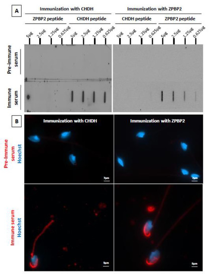 Immune response of male ATS immunized with species-specific peptides. Male ATS were immunized with a peptide of the CHDH or the ZPBP2 protein. (A) The presence of IgG in the pre-immune and immune sera was detected by a slot blot against decreasing quantities of the injected peptide. The specificity of the response was evaluated by blotting each serum against the two peptides. (B) Fresh ATS spermatozoa were double labelled with male ATS pre-immune or immune sera (red) and Hoechst 33342 (blue) and observed using an epifluorescence microscope (Zeiss) equipped with a digital camera, and the micrographs were taken using Zen software (Zeiss). The results in (A,B) are representative of experiments obtained with three different immunized male ATS for each peptide.