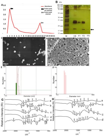 Isolation of TTI and characterization of nanoformulations (ECW and CW). (A) Chromatographic profile of F2 (which showed the highest antitrypsin activity) of tamarind seeds evaluated by spectrophotometry (Ultrospec™ 2100 pro UV/Visible Spectrophotometer, GE Heathcare Bio-Sciences Corp., Piscataway, NJ) at 280 nm. F2 = protein fraction 2. (B) Electrophoresis in denaturing polyacrylamide gel (SDS-PAGE) at 12.5% stained with silver nitrate. M = Marker; CE = Crude Extract; F1 = Protein fraction 1 (saturation with 0–30% ammonium sulfate); F2 = Protein fraction 2 (saturation with 30–60% ammonium sulfate); TTI = Trypsin inhibitor isolated from tamarind seeds after Trypsin-Sepharose affinity chromatography. (C) Scanning Electron Microscopy (SEM) of the ECW with a magnitude of 30 kX. (D) Scanning Electron Microscopy (SEM) of the CW with a magnification of 50 kX. (E) Laser diffraction obtained for ECW by dispersing nanoparticles in water and previous crosslinking using formaldehyde. (F) Laser diffraction obtained by CW by dispersing nanoparticles in water and previous crosslinking using formaldehyde. (G) ECW Fourier Transform Infrared Spectrum (FTIR): a. ECW; b. Tween 80; c. purified chitosan; d. whey protein isolate; e. TTI. (H) CW Fourier Transform Infrared Spectrum (FTIR): a. CW; b. Tween 80; c. purified chitosan; d. whey protein isolate. ECW trypsin inhibitor isolated from tamarind seeds encapsulated with whey protein isolate and chitosan (1:2:2 w/w/w); CW: chitosan–whey protein isolate nanoparticles (2:2 w/w).