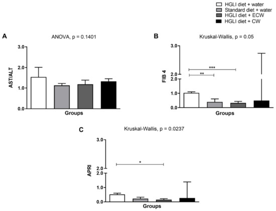 FIB-4 and APRI are also non-invasive methods that estimate fibrosis in the liver and are generally used for patients with hepatitis C but are being used as adjuvants to NAFLD diagnosis, in addition to imaging tests and biochemical parameters [14]. The analysis of FIB-4 (Figure 2B) showed a significant difference (p = 0.05) between animals without treatment and those treated with a standard diet and with ECW. A literature review showed that FIB-4 is a valuable screening tool to be applied routinely in clinical practice since it can accurately exclude patients with advanced fibrosis [64].