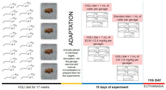 After the adaptation, the animals were randomly allocated to four groups to start the ten days of investigation: (1) HGLI diet + 1 mL of water per gavage (n = 5); (2) standard diet (Labina®) + 1 mL of water per gavage (n = 5); (3) HGLI diet + 1 mL of ECW dispersion (12.5 mg/kg per gavage) (n = 5); and (4) HGLI diet + 1 mL of CW dispersion (10.0 mg/kg per gavage) (n = 5). The animals received the treatment once a day. They were kept in individual cages, with water and feed offered ad libitum, under 12 h light/dark cycle conditions, with an average temperature of 23–25 °C and controlled humidity (50 ± 5%).