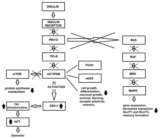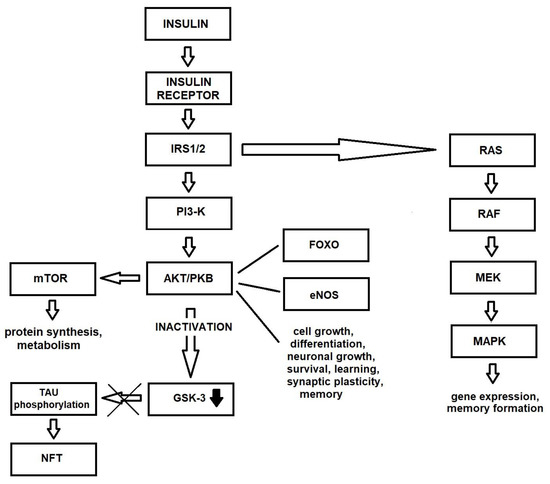 Many molecules are involved in insulin signaling cascades, known to play key roles in brain functions. Two of these are insulin signal transduction pathways: one, PI3-K/AKT (phosphatidylinositol 3-kinase/protein kinase B, PKB), is responsible for metabolism and lipid and protein synthesis, while the other, MAPK (mitogen-activated protein kinase) influences cell growth, survival and gene expression [26,27].