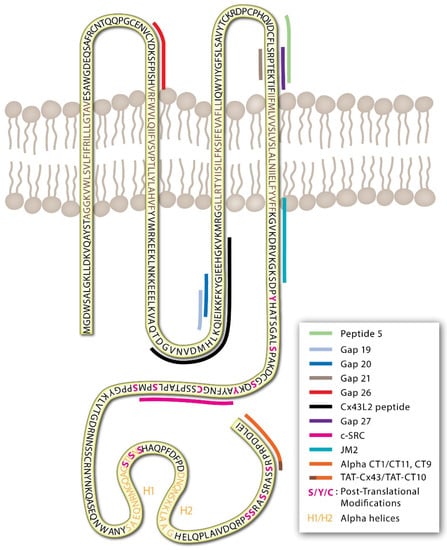 - Leithe, E.; Mesnil, M.; Aasen, T. The connexin 43 C-terminus: A tail of many tales. Biochim. Biophys. Acta Biomembr. 2018, 1860, 48–64. [Google Scholar] [CrossRef] [PubMed]