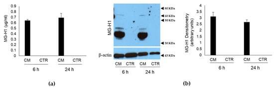 To investigate whether PC3 bone metastasis-derived PCa cells affected the homeostasis of human OB through MG-H1 secretion, PC3 were firstly cultured for 6 and 24 h in a humidified atmosphere at 37 °C, and the culture medium (conditioned medium, CM) was used to determine the levels of MG-H1 by a specific ELISA assay and Western blot (WB). As a control, the levels of MG-H1 were evaluated in the specific growth medium of OB, where they were cultured for the same period of time (control, CTR). Finally, the levels of MG-H1 were also determined in the fresh growth medium of both OB and PC3 cells before it was administrated to cells. As shown in Figure 1, MG-H1 was present only in PC3 CM, while nor CTR cells (Figure 1) nor OB and PC3 cells fresh medium (Figure S1) contained it. To prove that MG-H1 release was specifically associated with bone metastasis-derived PC3 cells, LNCaP cells, derived from a left supraclavicular lymph node metastasis and DU-145 cells, derived from a central nervous system metastasis, were grown for 24 h in RPMI medium [22] and MG-H1 was evaluated by WB in their CM. Finally, to show that MG-H1 was specifically released by PCa cells, also the non-cancerous PNT2 cells were cultured for 24 h in RPMI medium, and MG-H1 was measured in CM as above. As shown in Figure S1, none of these cells produced and secreted MG-H1, suggesting that MG-H1 release was specific to PCa cells disseminating to the bone.