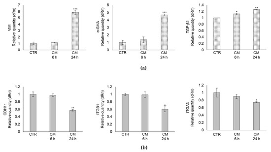 To further prove that PC3 cells could induce the cellular regression of the mature phenotype of human OB to a less-differentiated, mesenchymal cell-like one, through the secretion of MG-H1, we evaluated, at the transcript level, the expression profile of markers typically associated with the mesenchymal trans-differentiation process, namely vimentin (VIM) [27], alpha-smooth muscle actin (α-SMA) [28], and transforming growth factor beta (TGF-β1), a pivotal factor in OB trans-differentiation [29]. In parallel, the transcript level of some OB-specific adhesion proteins, namely cadherin 11 (CDH11) [30], integrin β1 (ITGB1) [31], and integrin α3 (ITGA3) [32], were evaluated. In line with the morphological results, we found that CM from PC3 cells induced in OB a significant increase in VIM and α-SMA mesenchymal cells markers as well as of TGF-β1 (Figure 3a), while it decreased CDH11, ITGB1, and ITGA3 adhesion molecules (Figure 3b), compared with CTR cells. Hence, these data also confirmed at the molecular level the observed morphological changes, thus further supporting the hypothesis that PC3 cells were able to reprogram mature OB into a less-differentiated mesenchymal-like stage through MG-H1 release. Moreover, these findings suggested that the diminished levels of ITGB1 and ITGA3 expression possibly reflected an inefficient cell adhesion, typically associated with a mesenchymal phenotype.