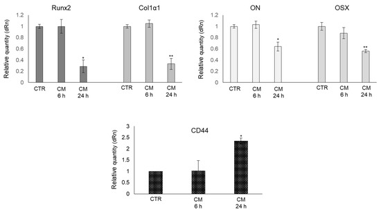 To further prove that PC3 cells were able to induce a shift of the mature phenotype of human OB to a less-differentiated one, we also determined the transcript level of some important molecules characteristic of OB mature phenotype, typically involved in osteogenic differentiation, namely runt-related transcription factor 2 (Runx2), collagen type I α1 (Col1α1), osteonectin (ON), osterix (OSX) [33] and the pre-osteoblast state marker, cluster of differentiation protein 44 (CD44) [34]. As shown in Figure 4, the mRNA expression of all OB-specific markers significantly decreased upon PC3 CM exposure at 24 h. Conversely, PC3 CM induced a significant increase in CD44 transcript levels with respect to OB grown in their own medium. Overall, this evidence further supported the role of PC3 cells in reverting back OB to a less-differentiated phenotype through MG-H1 release.