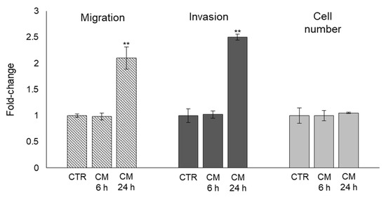 Effect of conditioned medium (CM) from PC3 bone metastasis-derived prostate cancer (PCa) cells on human primary osteoblasts (OB) migration, invasion, and proliferation. Migration and invasion were evaluated by specific assays, while cell proliferation by cell counting, in OB exposed for 6 and 24 h to CM from PC3 cells. Control cells (CTR) are represented by OB cultured for the same period of time in their specific growth medium. Two experimental CTRs were performed for each exposure time; being both of them set at 1, each histogram reports only one CTR. The histogram indicates the mean ± SD of two different cultures, and each was tested in triplicate. ** p < 0.01, versus CTR.