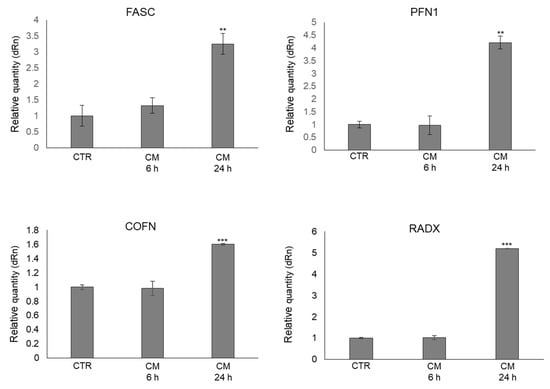 To further support the cytoplasmic rearrangement processes observed by the morphological analysis and presumably associated with the observed increased OB motility, we then evaluated the mRNA levels of some key proteins involved in the cytoskeletal dynamic formation of cell protrusion (e.g., filipodia) [36]. In particular, we considered fascin (FASC), profilin 1 (PFN1), cofilin (COFN), and radixin (RADX) [32]. As shown in Figure 6, OB treated with PC3 CM presented a marked up-regulation of all the considered genes compared with control cells, also sustaining at the molecular level the occurrence of cytoplasmic rearrangement processes and, in particular, the formation of filopodia-like protrusions already evidenced by the morphological analysis.