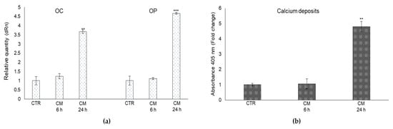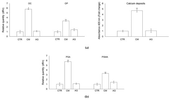 PCa bone metastases are characterized by abnormally hypermineralized bone due to OB hyperactivity [6]. To investigate whether MG-H1-containing PC3 cells CM could somehow take part in this anomalous process, we first measured the mRNA expression of proteins typically involved in OB extracellular matrix mineralization, namely the non-collagenous protein osteocalcin (OC) and osteopontin (OP) [37]. In comparison with the control cells, the mRNA expression of OC and OP were significantly increased in OB exposed to PCa cells CM at 24 h post-exposure (Figure 7a). Subsequently, since OB mineralization also requires the deposition of the inorganic component (mineralized matrix) made up of hydroxyapatite crystals rich in calcium and phosphate [38], we evaluated the effect of CM from PC3 cells on OB mineral formation, evaluating calcium deposits by alizarin red staining method. As displayed in Figure 7b, PC3 cells-derived CM enhanced mineralization of OB at 24 h compared with controls.