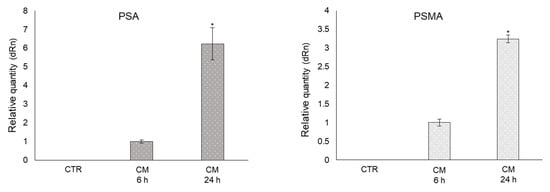 Conditioned medium (CM) from PC3 cells induces de novo expression of the prostate-specific antigens PSA and PSMA (prostate-specific membrane antigen) in OB. Transcript levels were evaluated by real-time PCR in OB exposed for 6 and 24 h to CM from PC3 cells. Control cells (CTR) are represented by OB cultured for the same period of time in their specific growth medium. Two experimental CTRs were performed for each exposure time; being both of them set at 1, each histogram reports only one CTR. The histogram indicates the mean ± SD of two different cultures, and each was tested in triplicate. * p < 0.05.
