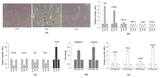 Overall, our results suggested that MG-H1, released from PC3 cancer cells, was able to induce OB phenotype regression consisting in the assumption of mesenchymal-like and prostate-specific traits and in gaining an enhanced mineralization capability, all these being hallmarks of PCa-associated bone metastases. To prove all this causatively, we pre-treated PC3 cells with aminoguanidine (AG), a specific MG scavenger [23], thus able to prevent MG-derived MG-H1 formation and release into the medium (Figure S2), for 6 h at 1 mM. Then, we collected the CM derived from PC3 treated with AG and administrated it to OB. Finally, OB morphology (Figure 9a), the expression of mesenchymal trans-differentiation-associated markers (VIM, α-SMA, TGF-β1, CDH11, ITGB1, ITGA3) (Figure 9b), the expression of markers associated with OB mature phenotype (Runx2, Col1α1, ON, OSX), the expression of the pre-osteoblast state marker CD44 (Figure 9c), migration and invasion (Figure 9d), the mRNA expression of proteins involved in the formation of filopodia-like protrusions (FASC, PFN1, COFN, RADX) (Figure 9e), bone mineralization through OC and OP expression and calcium deposits formation (Figure 10a), and the expression of the prostate-specific markers PSA/PSMA (Figure 10b), were evaluated compared with OB treated with PC3 cells CM not pre-treated with AG. As shown in Figure 9 and Figure 10, AG pre-treatment was able to completely abrogate the effects induced by MG-H1-containing CM on the above molecules and processes, thus confirming that MG-derived MG-H1 is a novel paracrine factor released by bone metastasis-derived PC3 cells to reprogram human OB into a mesenchymal-, malignant-like, and more invasive phenotype. These results were additionally confirmed by inducing MG-H1 accumulation through Glo1 silencing since this maneuver potentiated the studied responses (Figure S3).