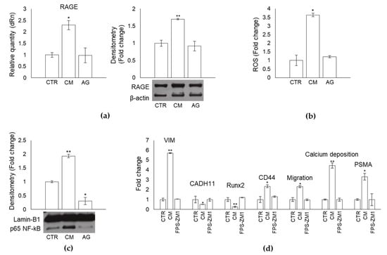 MG-H1 can signal through receptor for AGEs (RAGE) [15] to trigger ROS intracellular accumulation that, in turn, actives NF-kB pathway [17]. Hence, we investigated whether MG-H1-induced OB dedifferentiation occurred through a RAGE-dependent mechanism, possibly involving reactive oxidative species (ROS) and the NF-kB pathway. Indeed, we found that PC3 CM-containing MG-H1 induced a significant increase in RAGE expression at both transcriptional and protein levels (Figure 11a), ROS intracellular amount (Figure 11b), and NF-kB-p65 nuclear levels (Figure 11c), compared with OB controls, while CM from PC3 pre-treated with AG prevented all these changes (Figure 11a,b), bringing NF-kB-p65 levels even under those of control (Figure 11c). These results suggested that MG-derived MG-H1 released by bone metastasis-derived PC3 cells reprograms human OB into a mesenchymal-, malignant-like phenotype through a RAGE-dependent mechanism. Importantly, upon MG-H1-containing PC3 CM exposure, blockade of RAGE with the high-affinity RAGE-specific inhibitor FPS-ZM1 [41,42], rescued OB dedifferentiation and re-wiring, evaluated by VIM, CADH11, Runx 2, CD44, migration, and PSMA levels (Figure 11d).