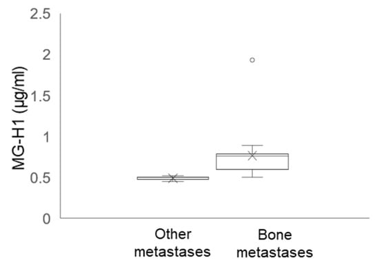 To provide a potential clinical value to our results, we finally measured the circulating levels of MG-H1 in patients with metastatic PCa (n = 30), previously enrolled [23]. In particular, among this cohort, we identified patients with bone metastases (n = 20) and patients with metastases to other organs (n = 10). In support of the mechanistic in vitro results, we found that patients with bone metastases presented significantly higher levels of MG-H1 than those with metastases to other organs (Figure 12).