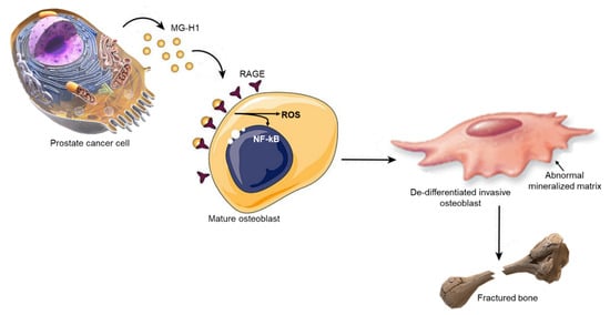 Overall, these findings indicated that MG-derived MG-H1 released by bone metastasis-derived PC3 cells reprogrammed human primary OB into a mesenchymal-, malignant-like phenotype through a RAGE-dependent mechanism with the involvement of ROS and NF-kB signaling.