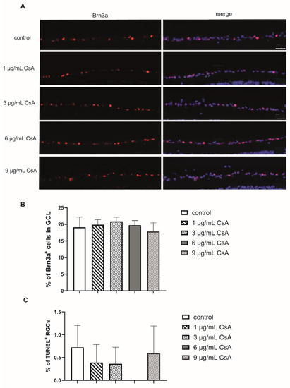 Biocompatibility of the different CsA concentrations. (A) Representative pictures of the Brn3a in each group after 48 h. Scale bar indicates 50 µm. (B) Quantification of Brn3a+ retinal ganglion cells (RGCs) labeld in red and cell nuclei (DAPI) in puple. The bar graph represents the percentage of these cells in the ganglion cell layer (GCL). (C) The percentage of TUNEL+ RGCs after 48 h of cultivation. Sections were double stained for DAPI and Brn3a. Bars and error bars indicate mean + SEM. (controls n = 10; all CsA groups n = 4–7).