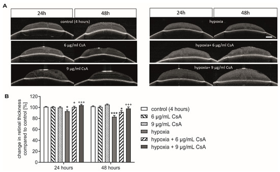 Since cell death results in a decrease of retinal thickness, the width of the retina was determined via optical coherence tomography (OCT) after 24 h and 48 h of cultivation [12]. Because the two higher concentrations did not lead to a negative effect, the further studies were only conducted with 6 µg/mL and 9 µg/mL of CsA. Measurements were taken after 4, 24, and 48 h. The 4 h time point served as a control and the thickness of the other two time points was calculated as a relative change compared to the control, which was set as 100%. Treatment with 6 and 9 µg/mL CsA alone did not alter retinal thickness after either 24 h or 48 h (Figure 3). Hypoxia induced a significant reduction in retinal thickness after 24 h (93.62%; p < 0.05) compared to the controls. The reduction was more pronounced after 48 h (83.06%; p < 0.001). The addition of CsA counteracted the effect of retinal thinning in a dose-dependent manner (Figure 3). Compared to the hypoxia group, treatment with 6 µg/mL CSA prevented thinning after 24 h (100.8%; p < 0.05) but not after 48 h (91.7%; p > 0.05). At a concentration of 9 µg/mL, CsA protected the retinal explants from thinning at both time points (24 h: 104.6%, p < 0.001; 48 h: 98.2%, p < 0.001) and ameliorated the hypoxic effect completely (Figure 3B).