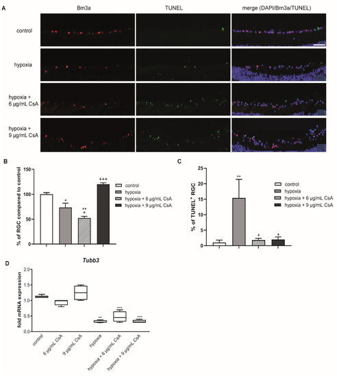 In line with these results, the percentage of TUNEL+ RGCs was significantly increased after hypoxic treatment compared to the controls (control group: 1%; hypoxia group: 15%; p < 0.01). Both CsA concentrations attenuated the hypoxic effect completely (6 µg/mL CsA: 1.8%; 9 µg/mL CsA: 2% TUNEL+ cells; p < 0.05) and significantly reduced the number of TUNEL+ RGCs compared to the hypoxia group (Figure 4C).