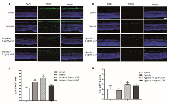 To investigate the response of glial cells and to verify the potential positive effects of CsA treatment on glial cells under hypoxia, we performed staining of the eye sections with antibodies against GFAP and CD11b (Figure 5A,B). Areas of DAPI, GFAP+, and CD11b+ signals were evaluated with ImageJ software and the percentage of the GFAP+ or CD11b+ area compared to the total area (DAPI) was calculated. After hypoxic treatment, the GFAP+ area increased significantly (p < 0.01) to 6.19% compared to the controls (4.26%). The 6 μg/mL CsA did not decrease the GFAP+ area but 9 μg/mL CsA ameliorated the GFAP+ area (6 μg/mL CsA: 7.61%, p < 0.001 with respect to the control condition and p < 0.05 with respect to hypoxic treatment; 9 μg/mL CsA: 5.03%, p > 0.05%) (Figure 5C).